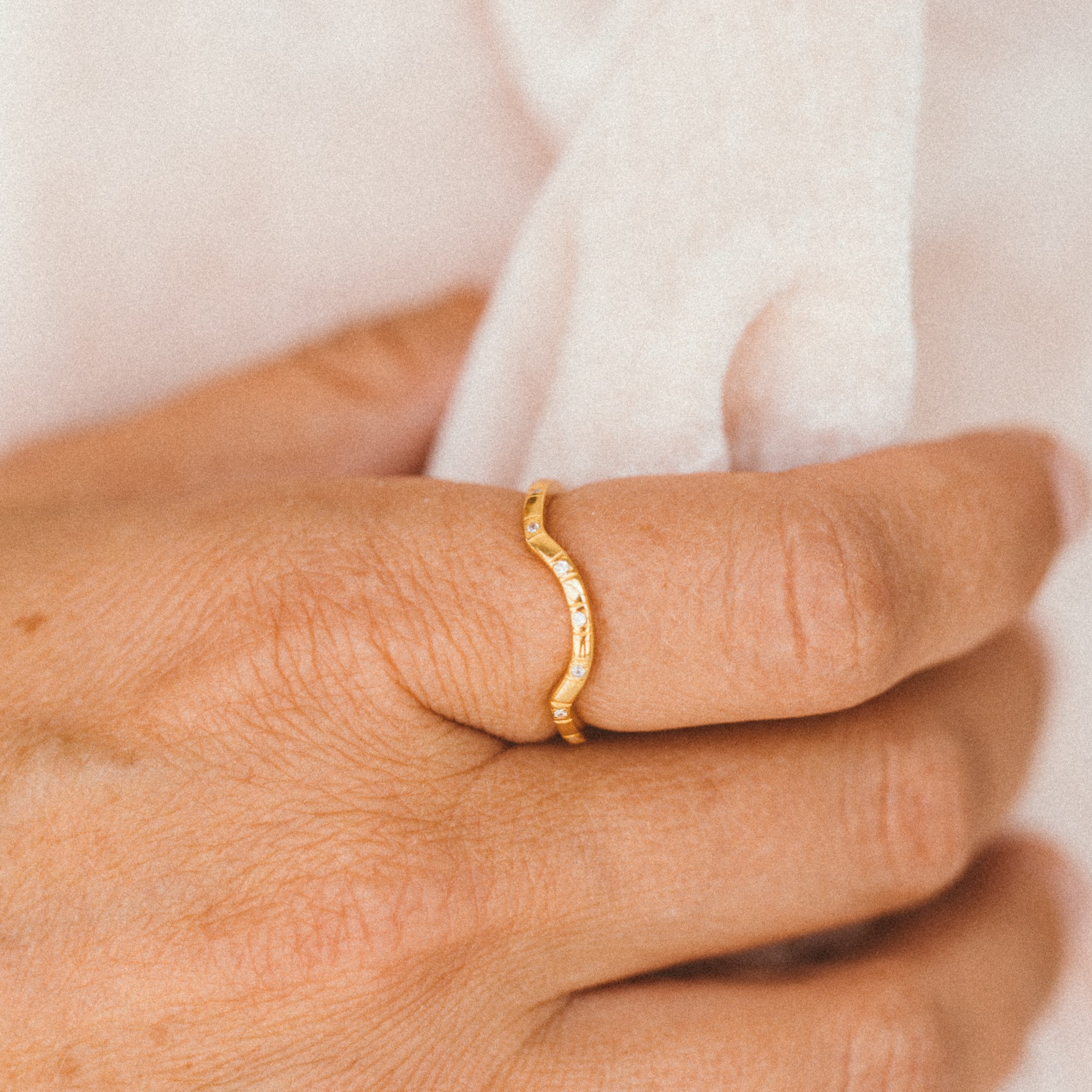 Introducing our stunning Vermeil Gold and Silver Curved CZ Stacking Ring! This exquisite piece is the perfect combination of elegance and versatility. Crafted in high-quality 18k Vermeil gold or Silver, with CZ White stone, these rings are water proof, and sweat proof.